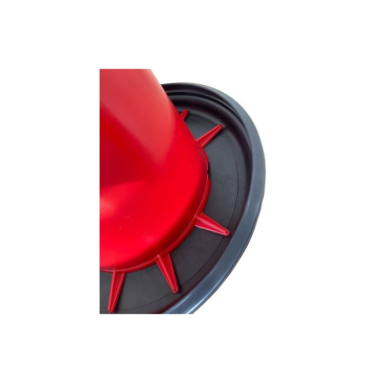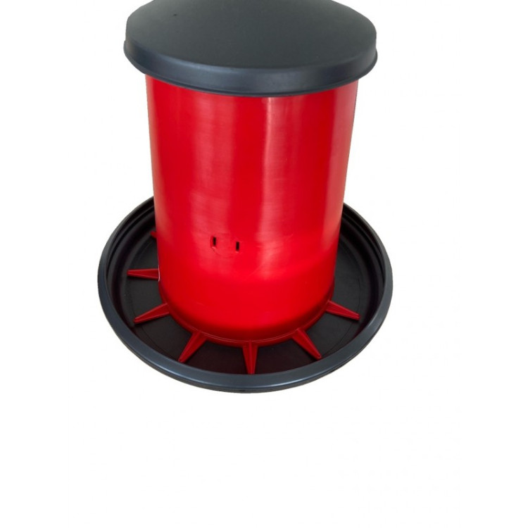Závesný kŕmny automat pre hydinu s kovovou stredovou tyčou na reguláciu kŕmnej dávky. Zavesením kŕmneho automatu sa znižuje riziko kontaminácie kŕmenia . Kŕmna dávka sa nastaví pomocou závlačky, ktorá sa zasunie do otvoru v stredovej tyči a tým sa valec upevní v požadovanej výške.