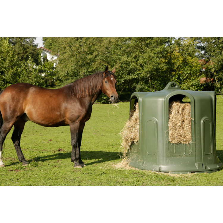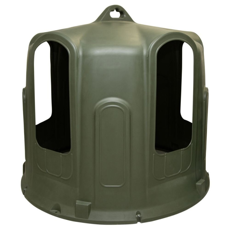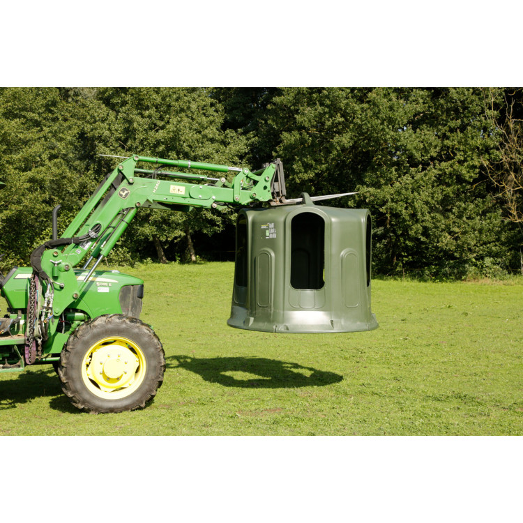 Plastový krmný zvon na kŕmenie dobytka a koní z okrúhlych balíkov sena. Vďaka 5 bezpečným kŕmnym otvorom majú zvieratá pohodlný prístup a stabilná konštrukcia drží zvon pevne na mieste. Na vonkajšie použitie je vyrobený z odolného plastu s UV ochranou, nad otvormi má odtokové žľaby a manipuláciu uľahčuje integrované zdvíhacie oko pre vidlicu čelného nakladača.
