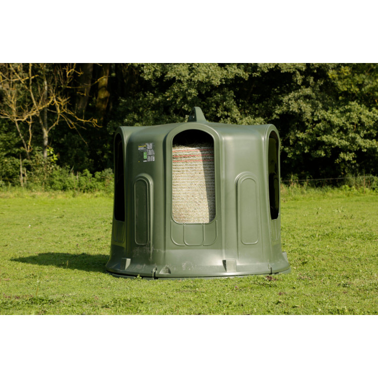 Keď potrebujete, aby kŕmne miesto zostalo pevne na jednom mieste, využijete integrované upevňovacie oká na ukotvenie k zemi. Na dodatočnú ochranu balíka je možné dokúpiť dno (predáva sa samostatne), ktoré je určené na suché skladovanie balíka a dá sa uzamknúť na prepravu sena.