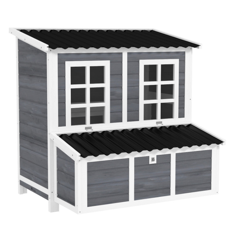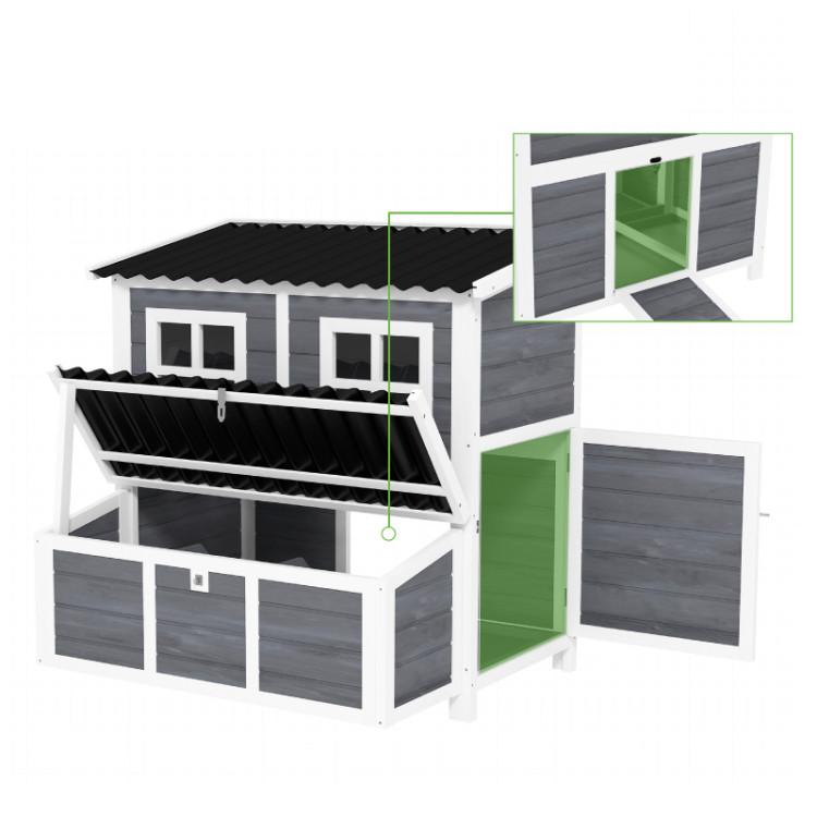 Vďaka dvom vstupným dverám a rampe môžu sliepky voľne a bezpečne prechádzať medzi kurníkom a vonkajším priestorom. Vnútorné bidlá poskytujú komfortné miesto na odpočinok a spánok, zatiaľ čo okná zaisťujú dostatok svetla a umožňujú kontrolu kŕdľa bez zbytočného rušenia. Kurník je vyrobený z kvalitného masívneho jedľového dreva a ošetrený vodeodolným náterom , ktorý predlžuje jeho životnosť. Vyvýšené prevedenie chráni konštrukciu pred vlhkosťou od zeme a zlepšuje cirkuláciu vzduchu. Plastová strecha potom poskytuje spoľahlivú ochranu proti dažďu a nepriaznivému počasiu.