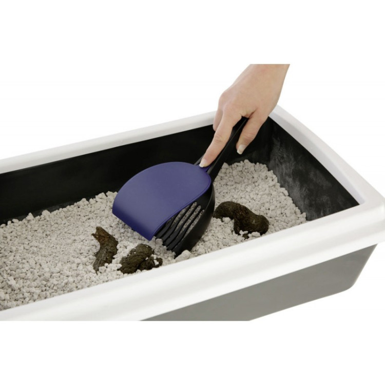 Praktická plastová lopatka na mačací trus so sitkom a vekom pre pohodlné odstránenie exkrementov z podstielky. Vďaka veku sa podstielka lepšie pretrepe a jednoducho sa oddelí trus od podstielky . Podstielka vďaka mriežke v lopácii prepadne späť do mačacej toalety a zostane na nej iba mačací trus. Podstielka preto vydrží dlhšie.