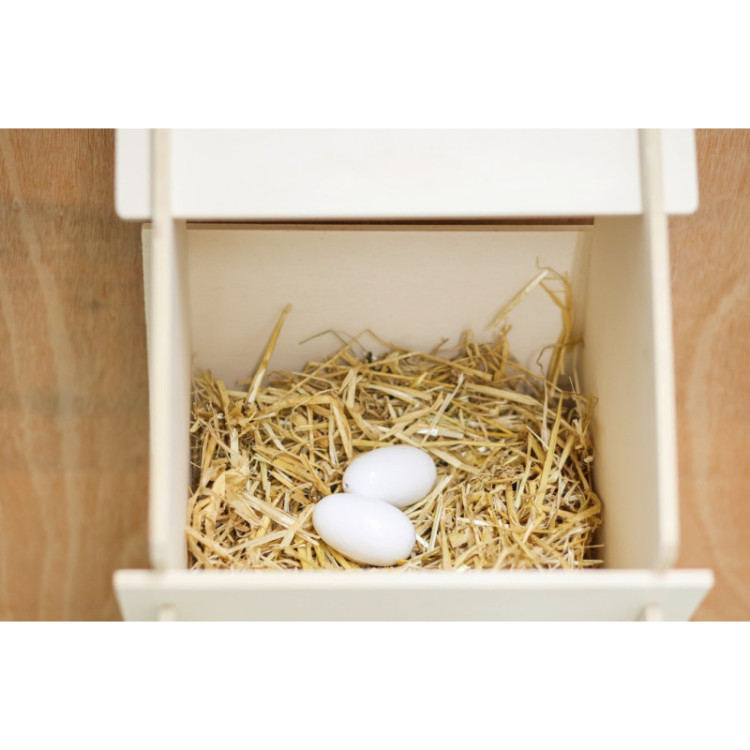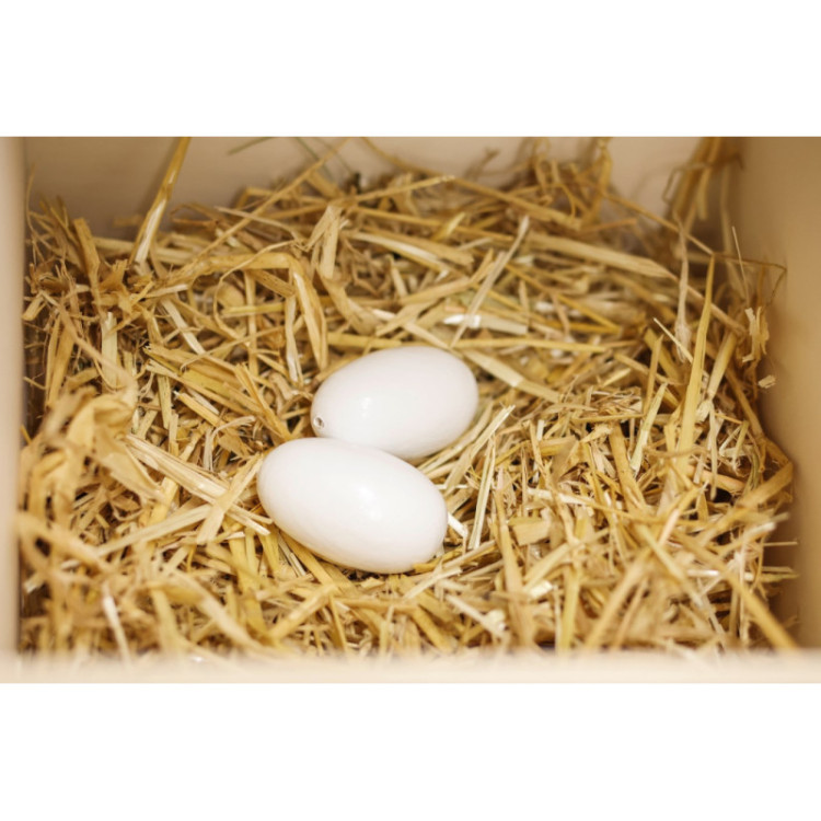 Podkladok pre sliepky drevený v bielej farbe. Umelé vajcia sa do hniezd podkladajú ako prevencia proti zanášaniu sliepok. Na určenie správneho miesta na znášanie a tiež na stimuláciu k znáške. Drevené podkladky majú tú výhodu, že sú veľmi odolné, majú dlhú životnosť av prípade prasknutia nehrozí nebezpečenstvo poranenia o ostré hrany.