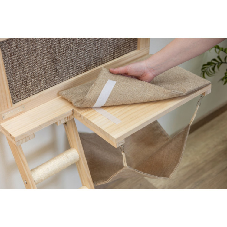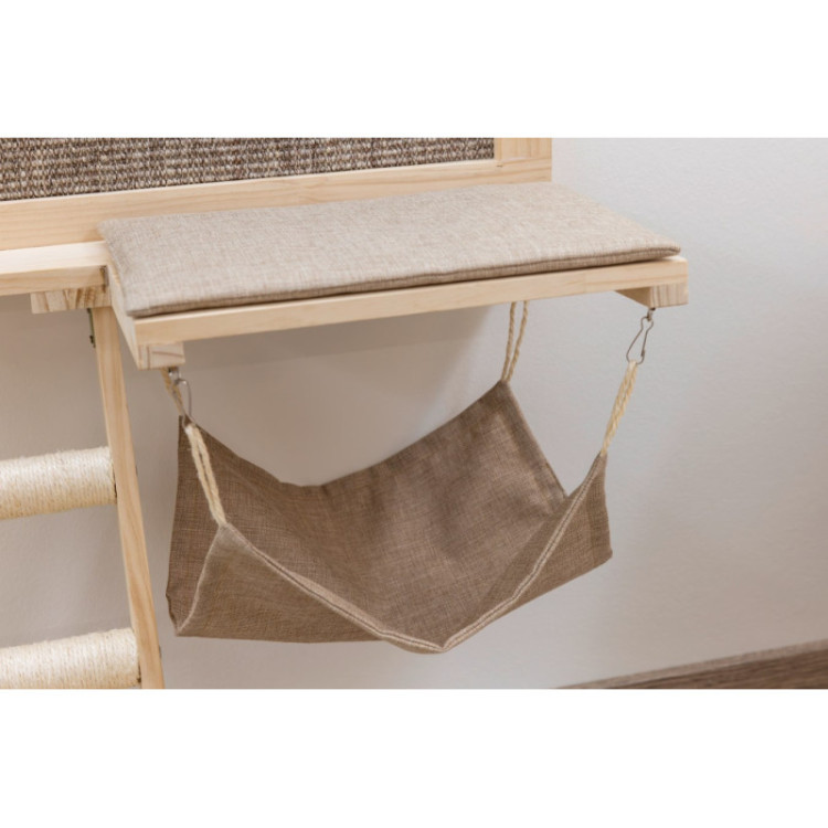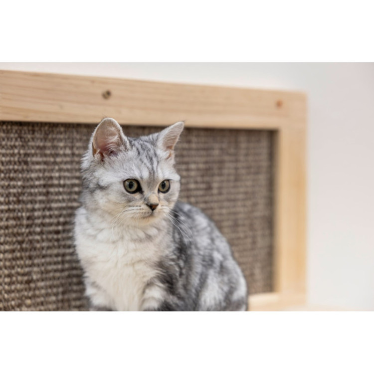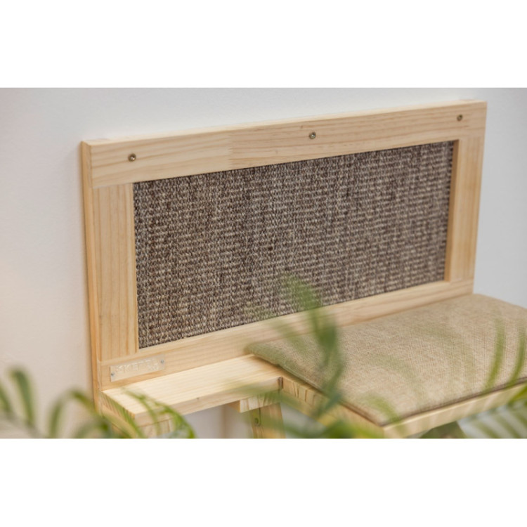 Elegantné, praktické a viacúčelové odpočívadlo pre mačky na stenu obsahuje odpočívaciu plochu s vankúšom , škrabadlo zo sisalu a závesnú hojdaciu sieť . Mačacie škrabadlo je vyrobené z robustného dreva, sisalu a polyesteru a zaručuje tak odolnosť a stabilitu. Integrované škrabadlo zo sisalu pomáha udržať pazúriky zdravé a zároveň ušetrí nábytok od škrabancov. Okolo schudkov je omotaný sisal pre pohodlný a bezpečný prístup na pozorovateľňu.