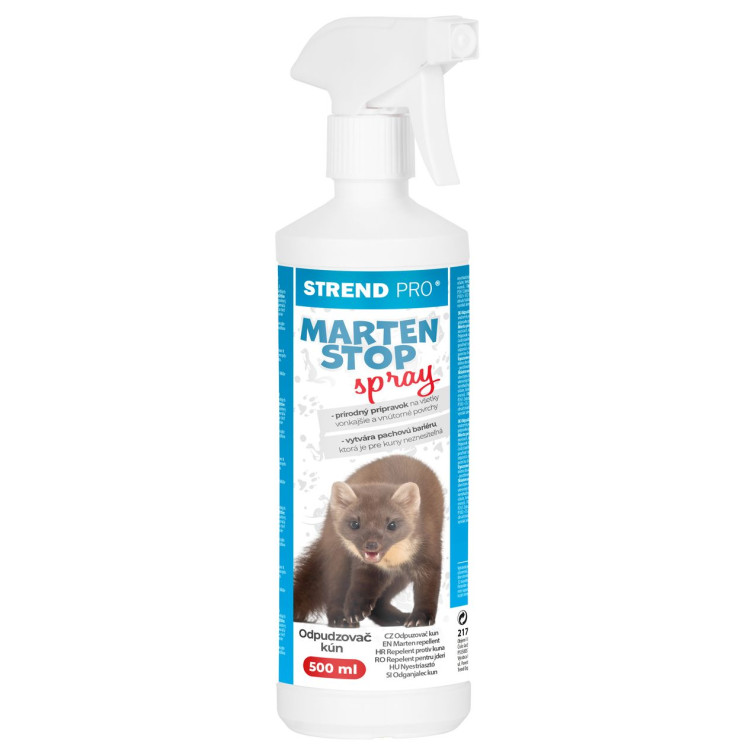 Strend Pro MARTEN STOP je vysoko účinný sprej určený na ochranu proti kunám. Je založený na špeciálnych aromatických zložkách, ktoré sú pre človeka nepostrehnuteľné, ale pre kuny veľmi nepríjemné. Po aplikácii vytvára ochrannú vrstvu odolnú voči teplu aj poveternostným vplyvom, vďaka čomu zaisťuje dlhodobú ochranu. Vhodný na použitie na plastové časti, chránené elektrické systémy, v domácnosti, na pôdach aj v garážach.
