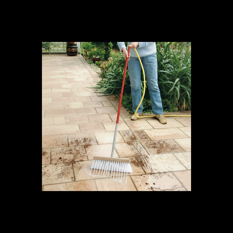 - Pustite vodu a veďte metličku po čistenom povrchu – kombinujte mechanické čistenie štetinami a priebežné oplachovanie.